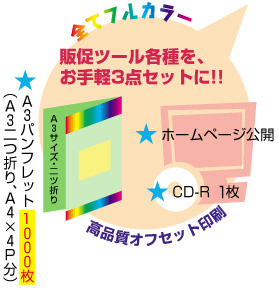 当パックは、事業を開始するのに必要な販促ツール(パンフレット・ホームページ・CD-R)をまとめて制作致します。デザイン料、印刷料、プログラム料、サーバー掲載料、CD-R、消費税込、送料込、代引手数料込全て含めて、