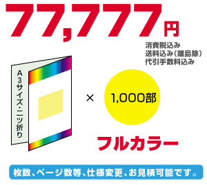 | 原稿・構成は揃っているのでデザインと印刷をお願いしたい。この様に会社案内や商品カタログ等の経費を少しでも少なくしたい方向けに、4色フルカラー・A4サイズ×4ページ・77,777円パックをご用意しました。初期投資を少しでも節約したい、これから起業される方、創業したばかりのベンチャー企業の方々に最適な印刷パックです。もちろん、用途は自由、会社案内や商品カタログだけでなく、色々なシーンでご利用いただけます。