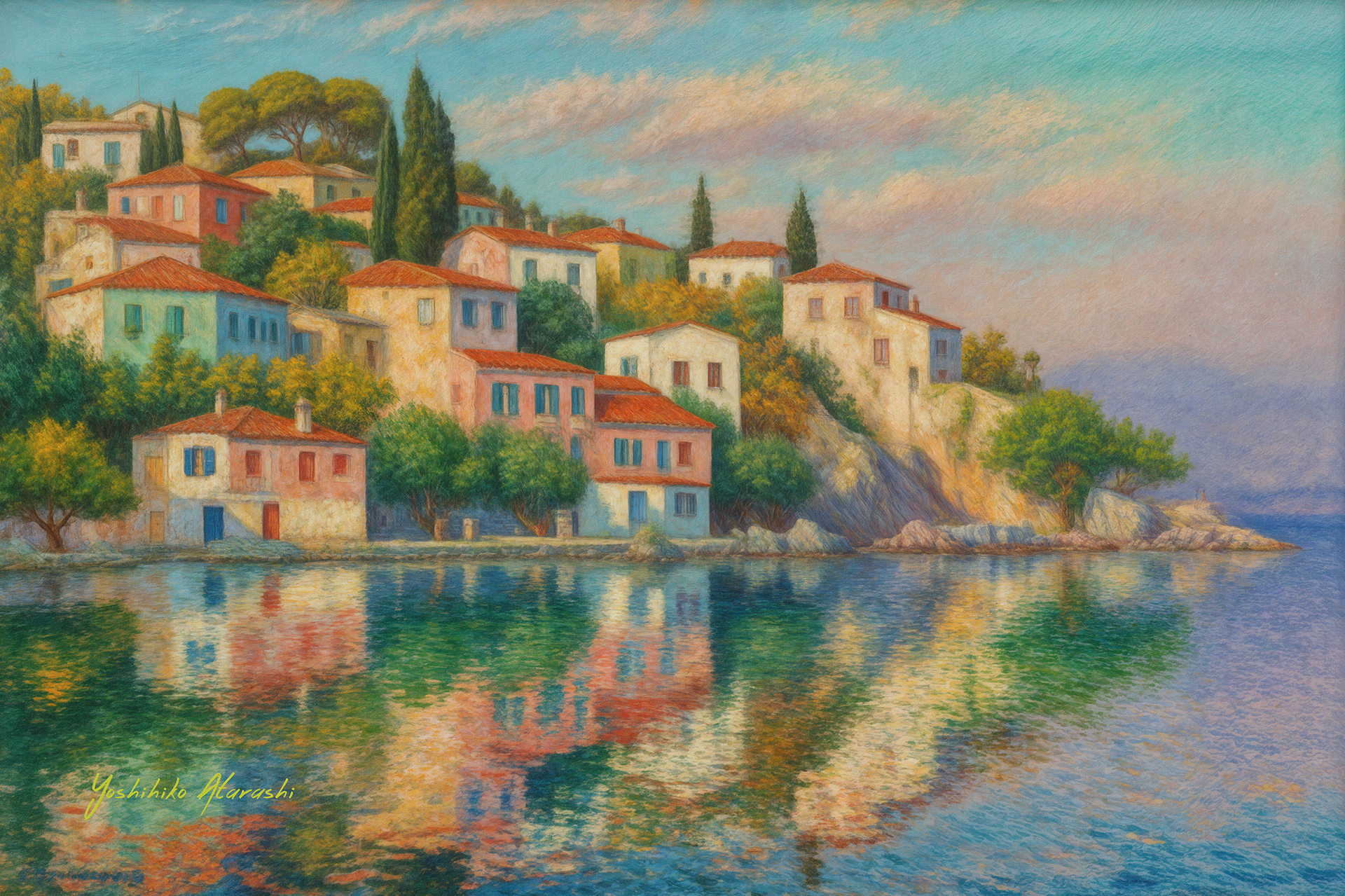 エーゲ海の港町-20240707: 製 作意図 この8つの風景画は、地中海沿岸の町々からインスピレーションを得て描きました。それぞれの絵には、青い海、白い建物、そして豊かな自然 が織りなす調和を表現しています。作画の意図は、観る人にその場にいるような感覚を味わってもらい、日常から離れた穏やかで開放的な気分 を提供することです。 光と影の対比、海の深い青、建物の温かみのある白でバランスを取り、鮮やかな色彩で街の活力を描き出しました。また、視点を様々な角度から取り入れることで、それぞれの町 の異なる個性や美しさを際立たせています。この作品群を通して、地中海の美しさと静寂、そしてその土地が持つ文化的魅力を伝えたいという 思いを込めています。 |