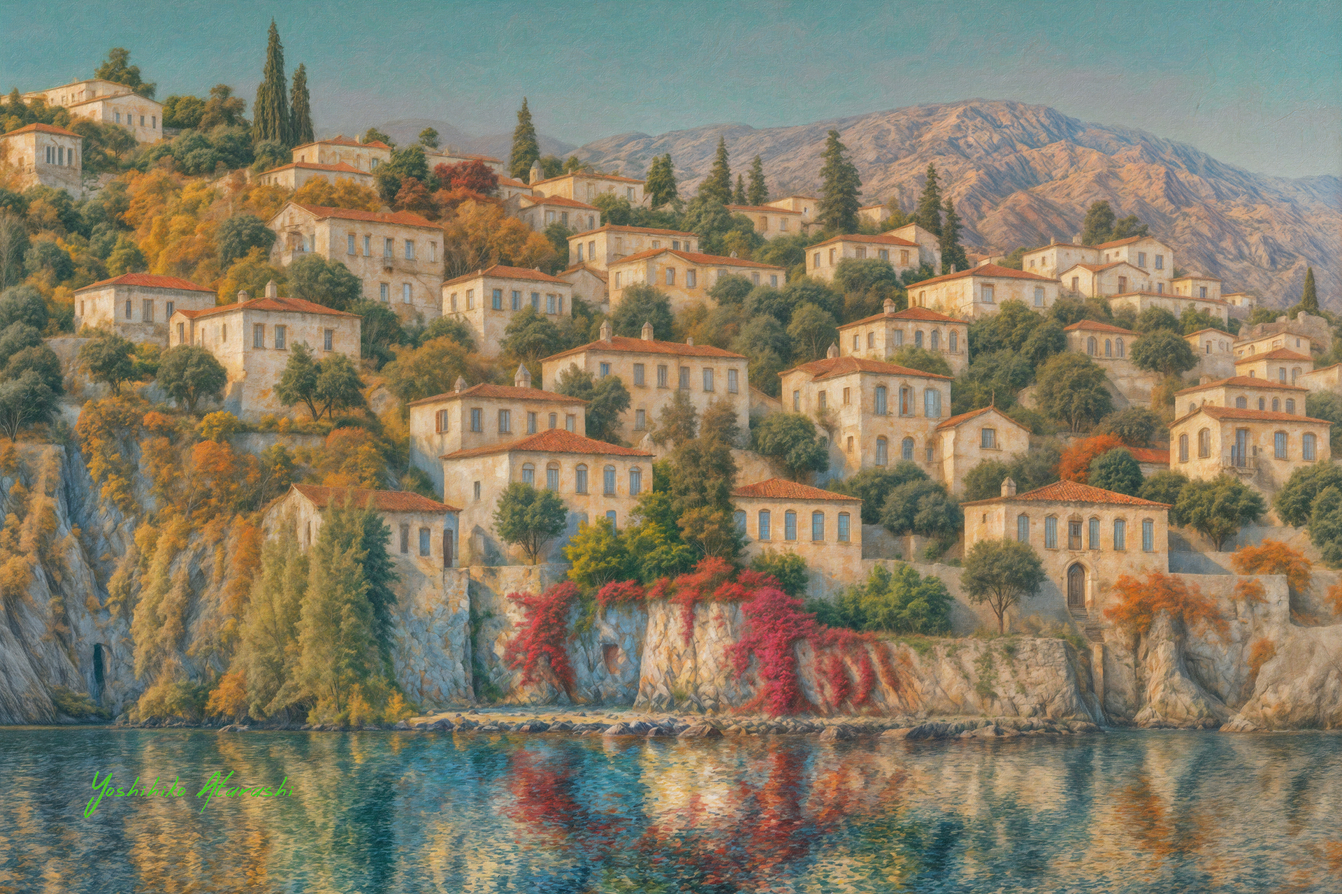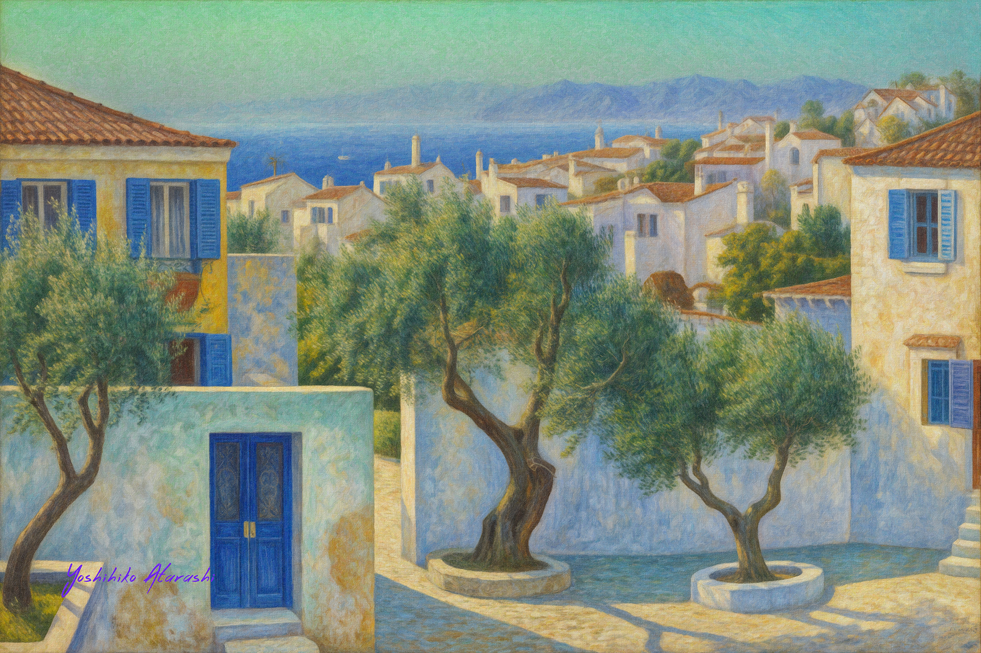ゲ海-海の見える風景-20250312 : 製 作意図 これらの作品は、エーゲ海の自然の美しさと穏やかな海辺の暮らしを描いた風景画です。風に揺れる色とりどりの花々、光を反射する青い海、 そして緩やかな丘の上に佇む家々が、心地よい静けさと幸福感を醸し出します。印象派の筆致を活かし、光と影の変化、鮮やかな色彩を通じ て、移ろいゆく時間や空気感を表現しました。この作品を通じて、観る人が心の安らぎを感じ、自然との調和を思い出してもらえれば幸いで す。 |