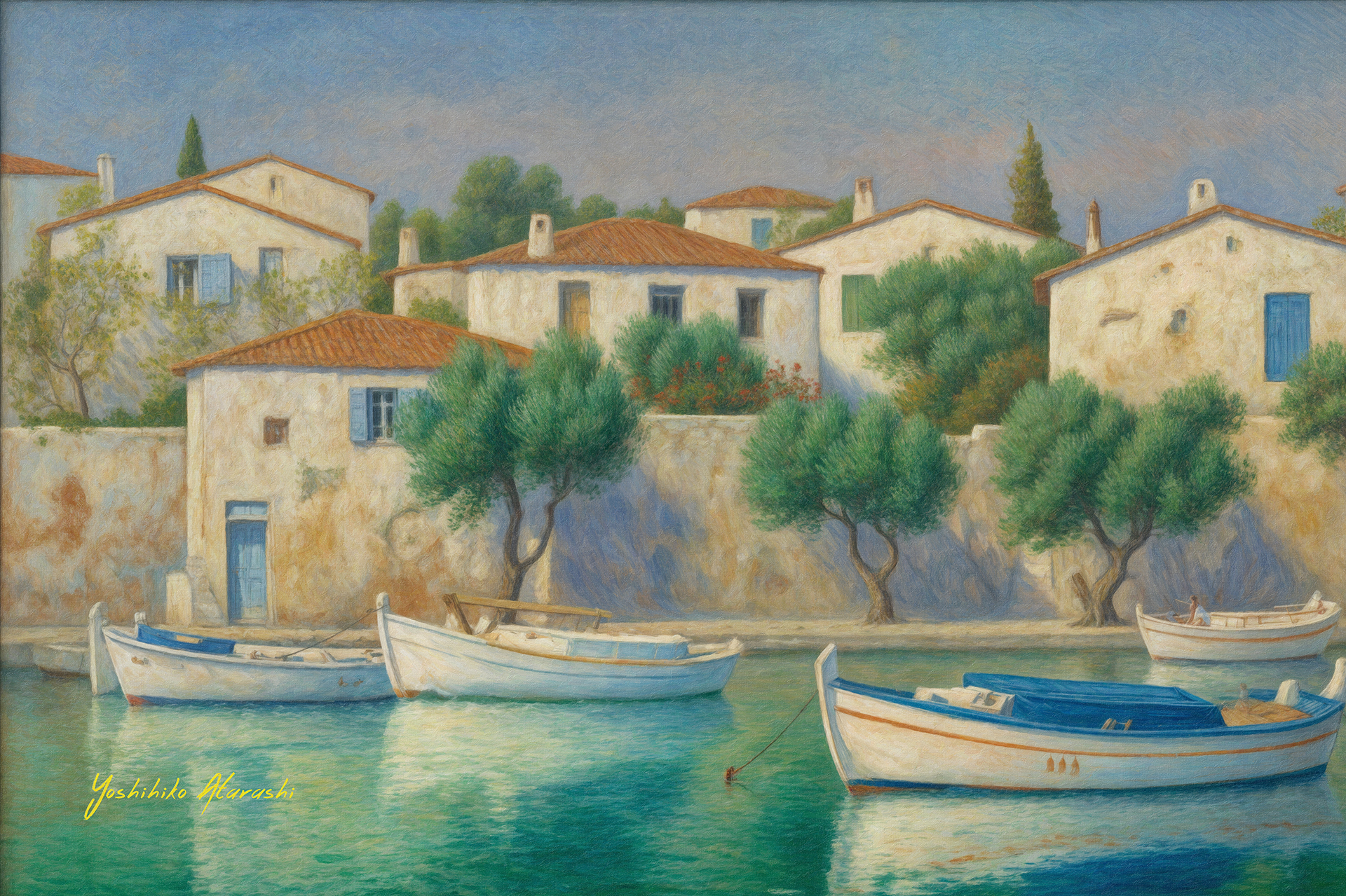 Comments 本作「エーゲ海の港町」シリーズは、旅情と色彩の詩です。軽やかな筆致と繊細な色の重なりが、懐かしくも新鮮な港町の風景を呼び起こしま す。印象派と抽象表現の融合による独自の世界観は、空間に豊かな物語性をもたらします。リビングやオフィスに飾ることで、まるで海風が吹 き抜けるような開放感と癒しを感じていただける逸品です。ぜひ一枚から、あなたの記憶に寄り添う風景をお迎えください。 |