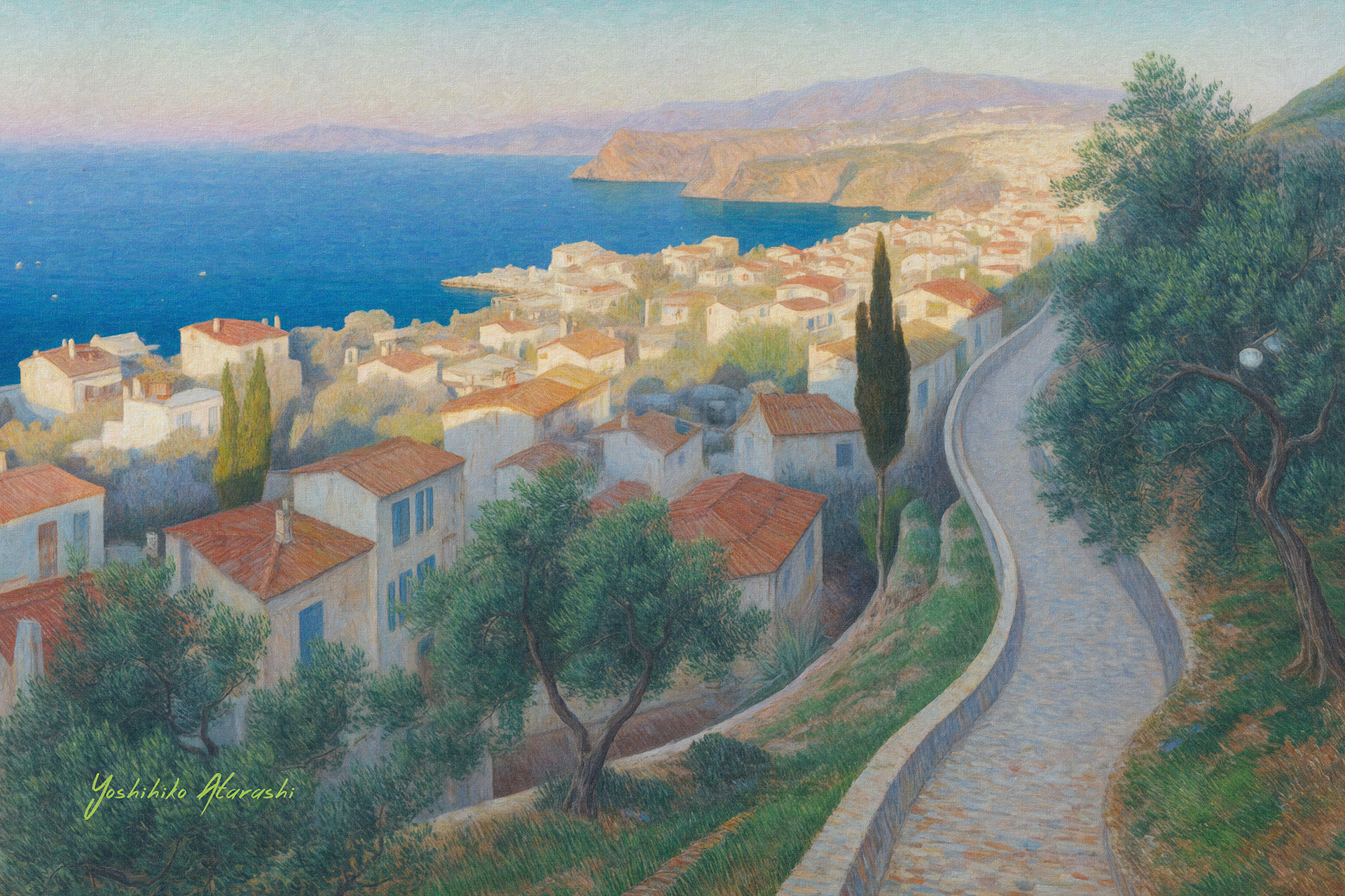 焼けの地中海の町-01: 製 作意図 この作品は、地中海の小さな町の朝、日が昇る前の静かな時間帯を捉えています。柔らかな黄色い光は路地を照らし、穏やかな空気感を醸し出 しています。青い空と光のコントラストは希望と新たな始まりを象徴しています。絵を通して、訪れたくなるような心地よい旅の一瞬を感じて いただければ幸いです。 |