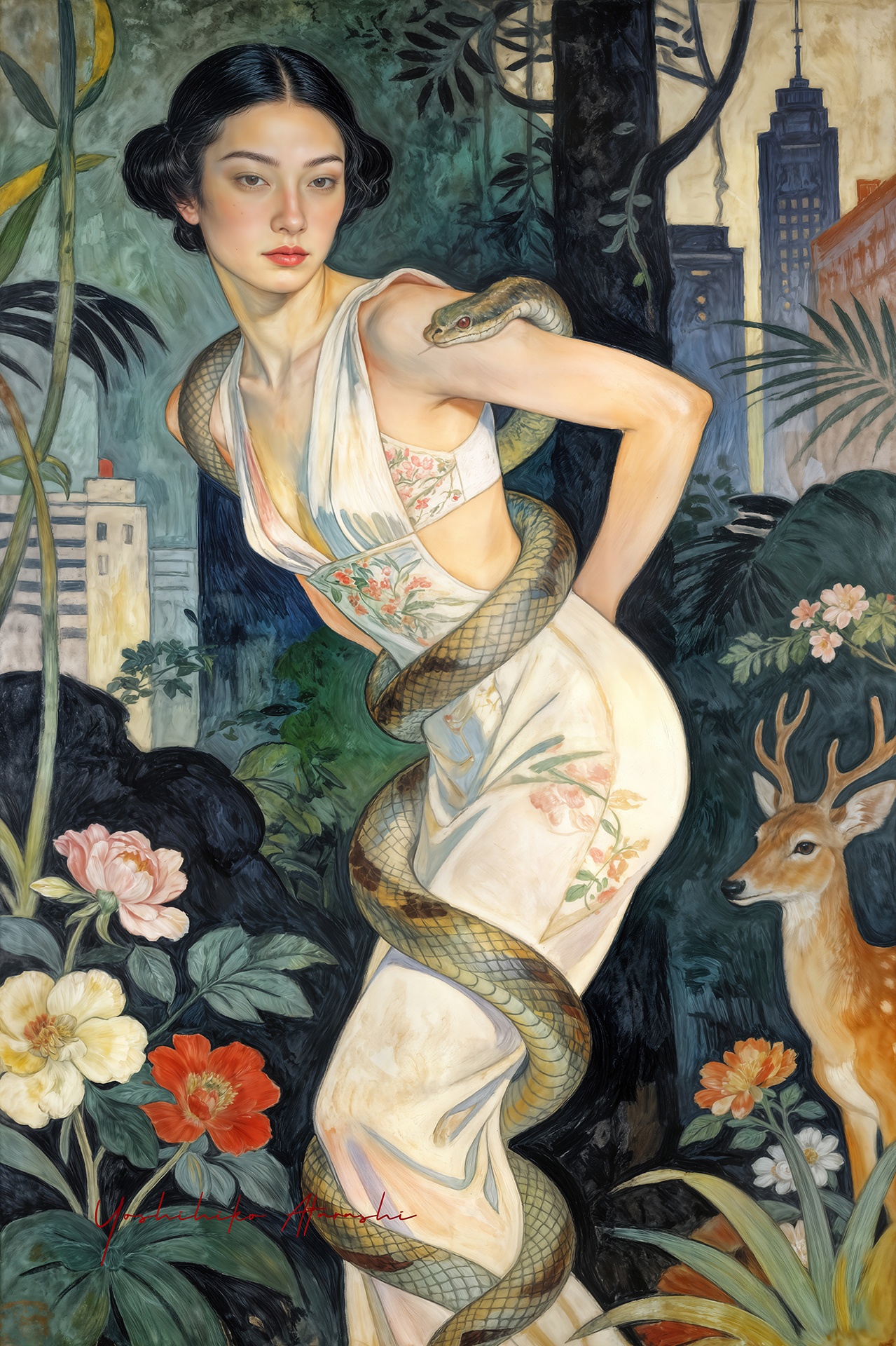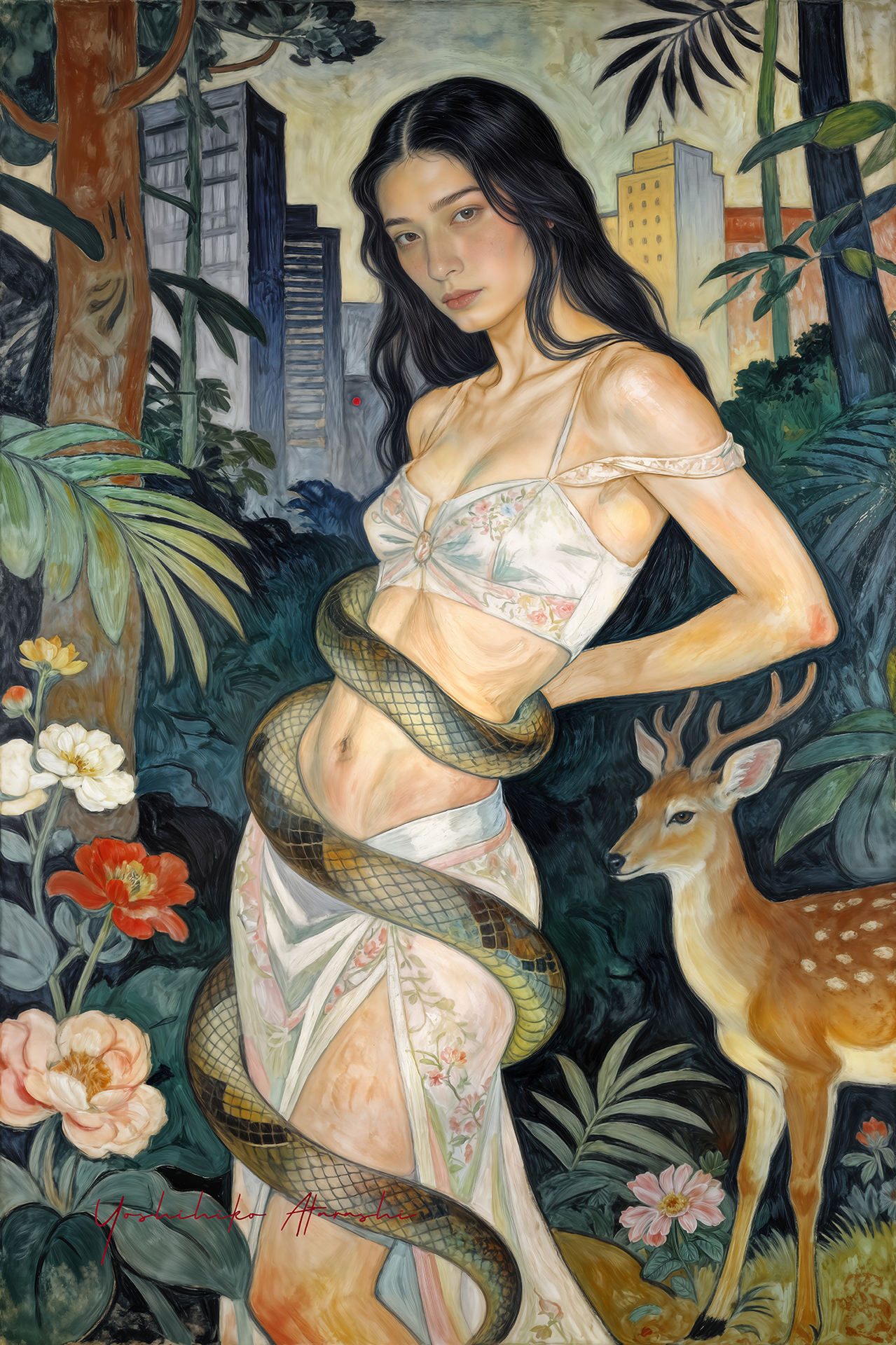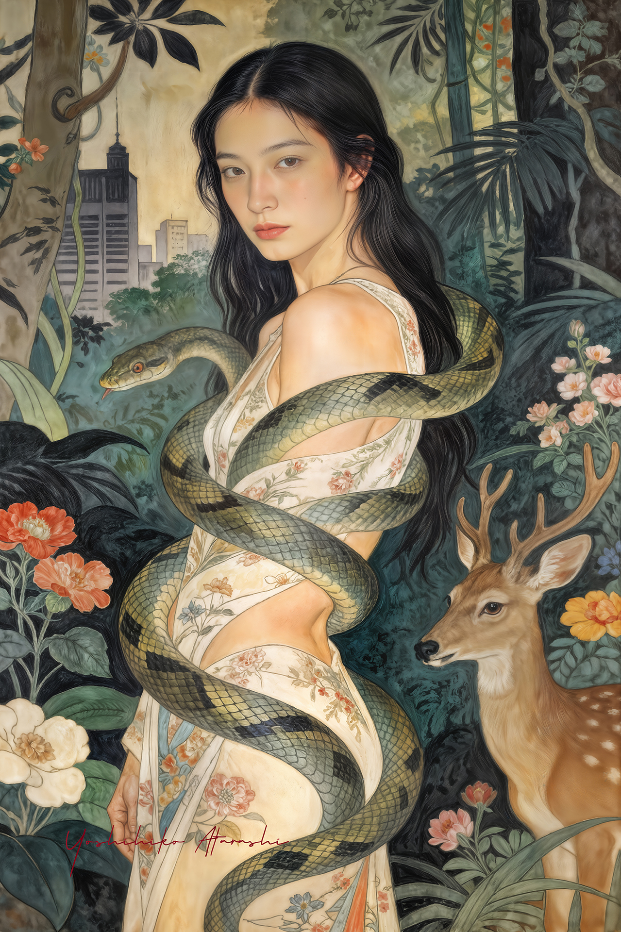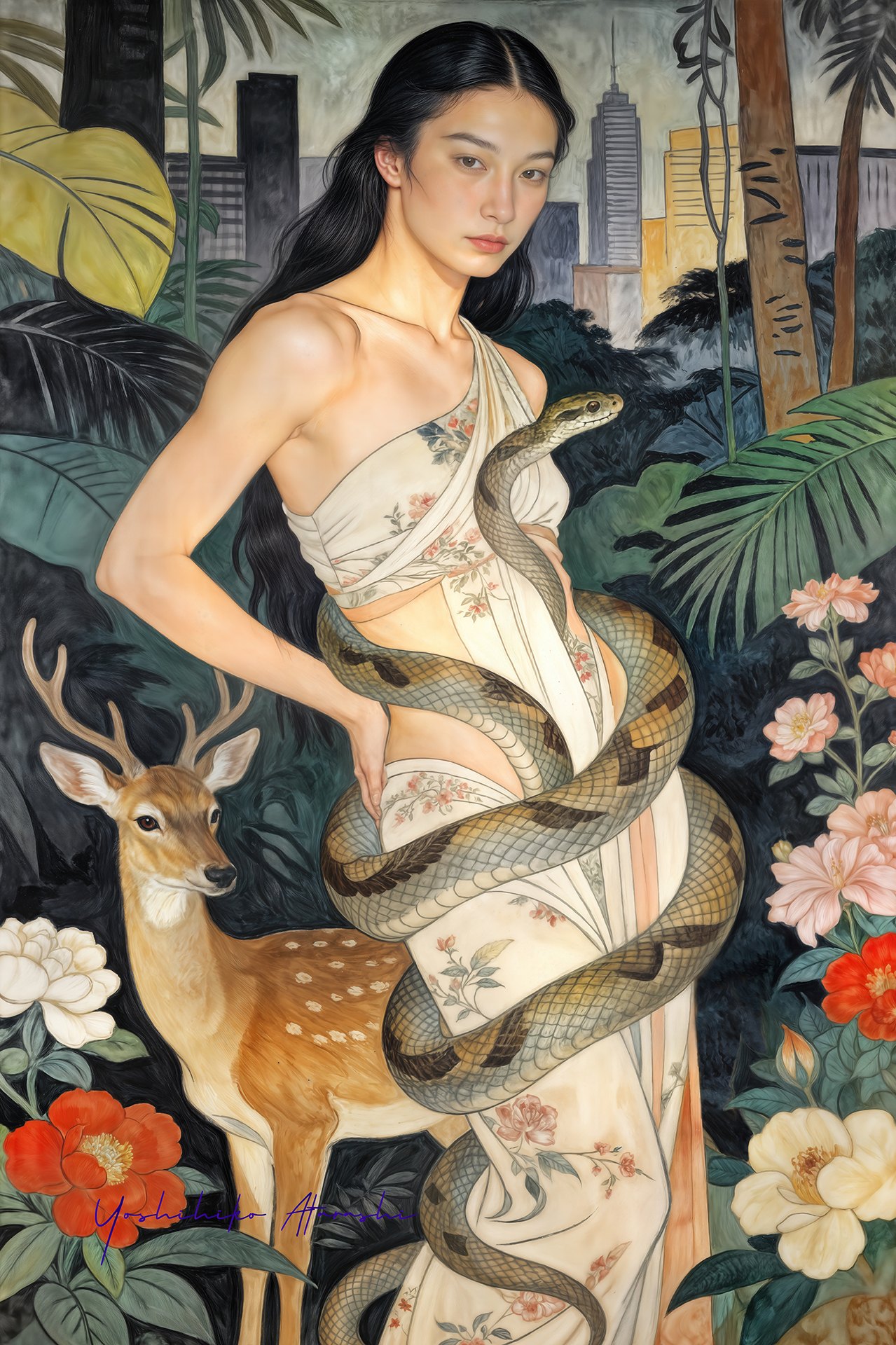 作意図 これらの作品は、自然と人、そして都市の気配が静かに重なり合う瞬間を描いています。蛇や植物、鹿といった象徴的なモチーフは、生命の循 環や内なる欲望、再生のイメージとして配置しました。曲線を強調した人体表現と装飾的な画面構成は、日本画や装飾絵画の影響を意識しつ つ、現代的な感性で再構成しています。見る人が物語を読み取るのではなく、時間や感情の揺らぎを画面の中で漂わせることを大切にしまし た。 。 |