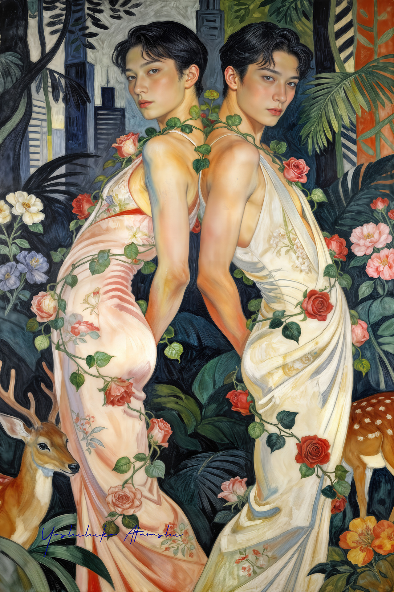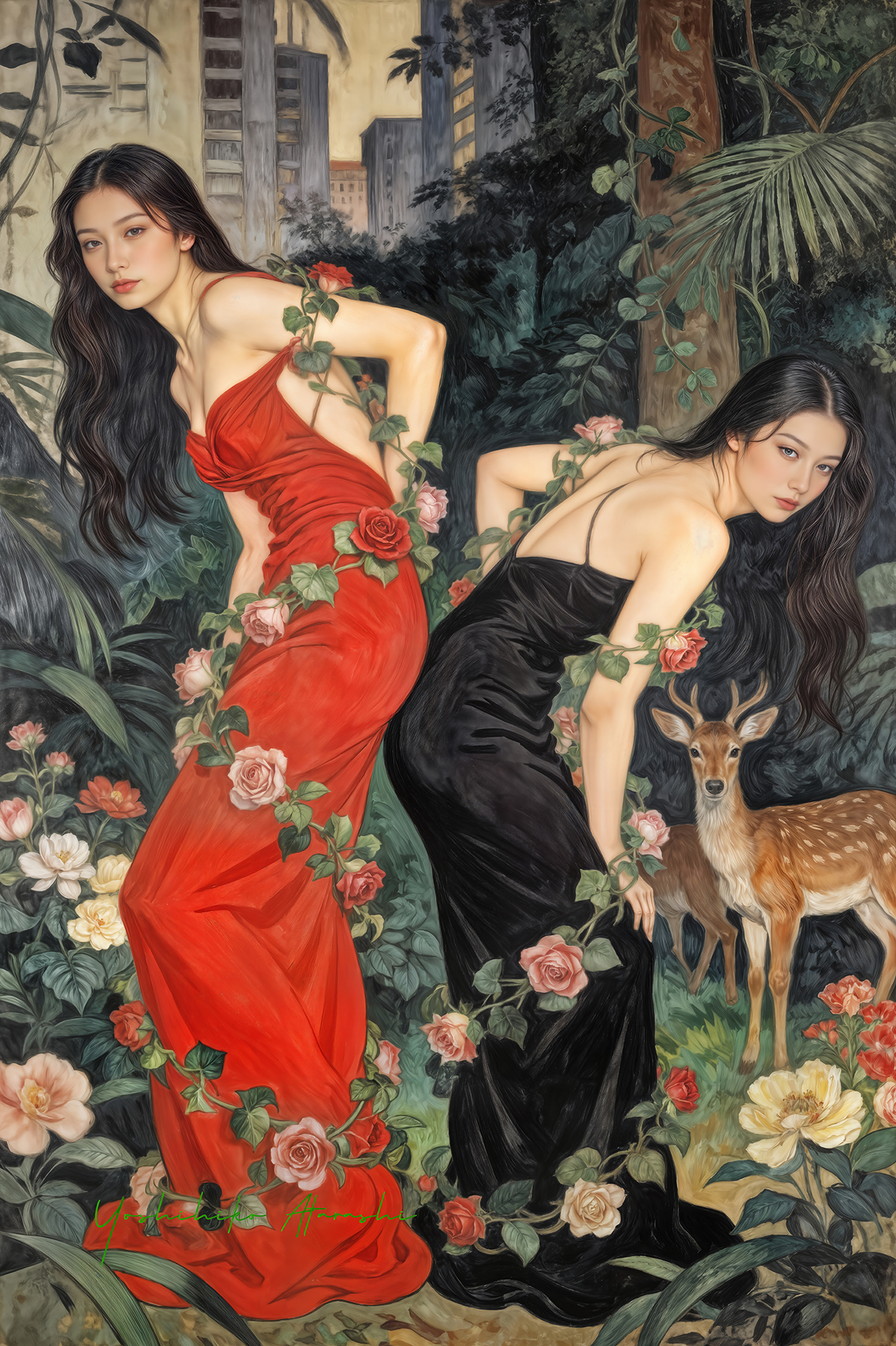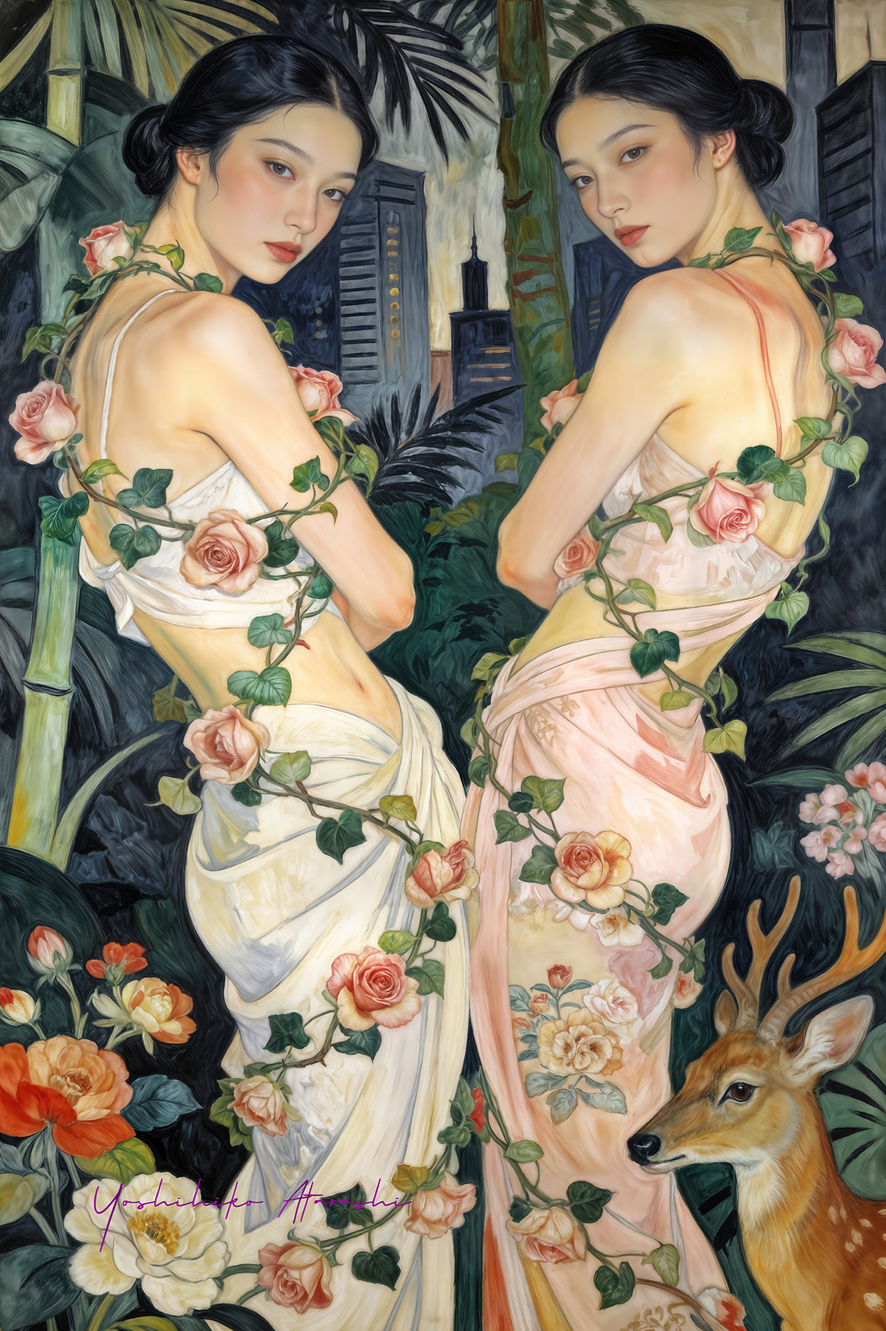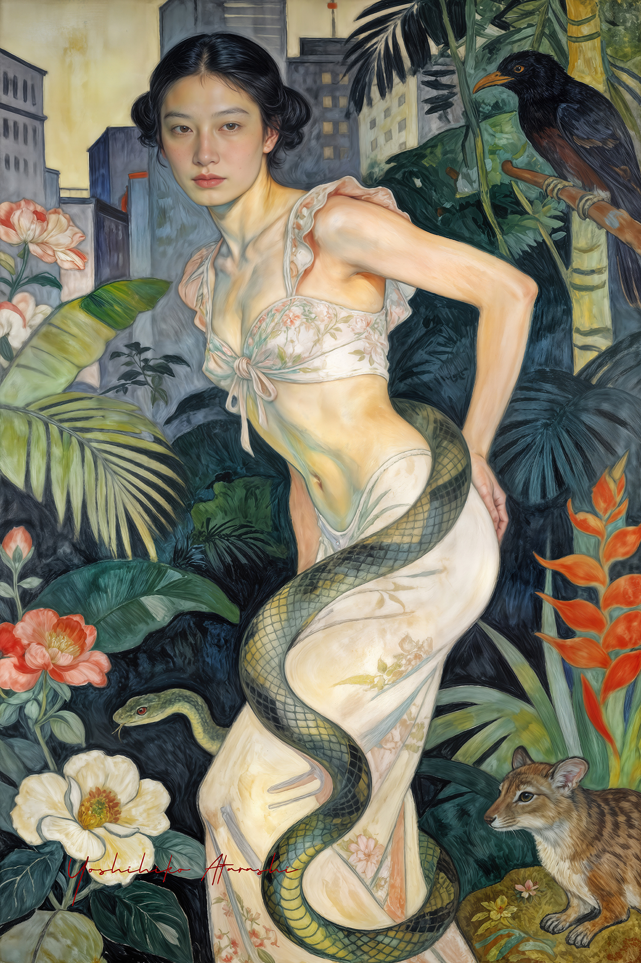 作意図 これらの作品は、自然と人、そして都市の気配が静かに重なり合う瞬間を描いています。蛇や植物、鹿といった象徴的なモチーフは、生命の循 環や内なる欲望、再生のイメージとして配置しました。曲線を強調した人体表現と装飾的な画面構成は、日本画や装飾絵画の影響を意識しつ つ、現代的な感性で再構成しています。見る人が物語を読み取るのではなく、時間や感情の揺らぎを画面の中で漂わせることを大切にしまし た。 。 |