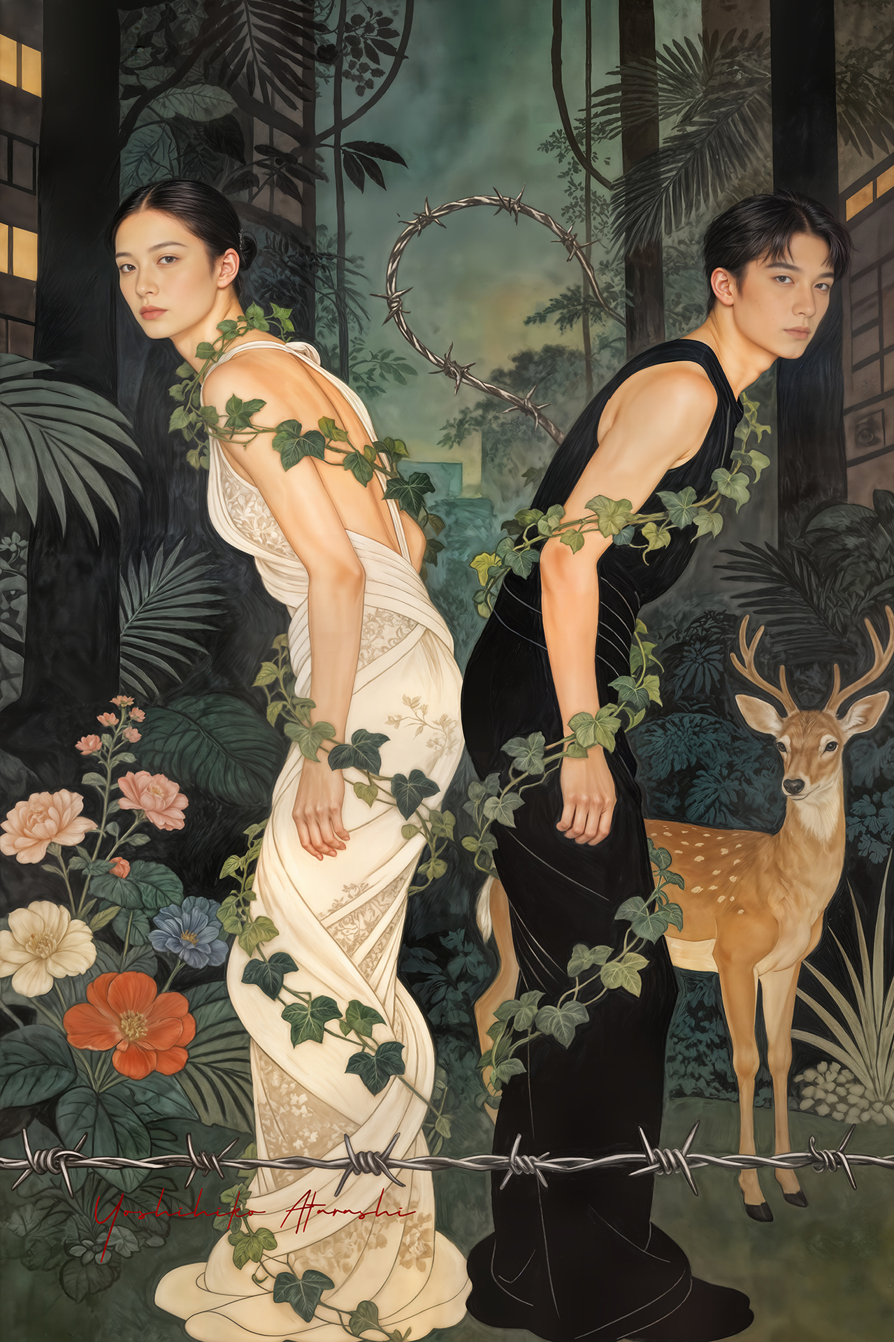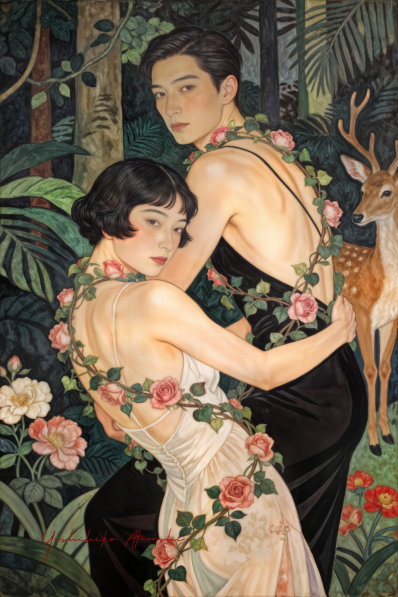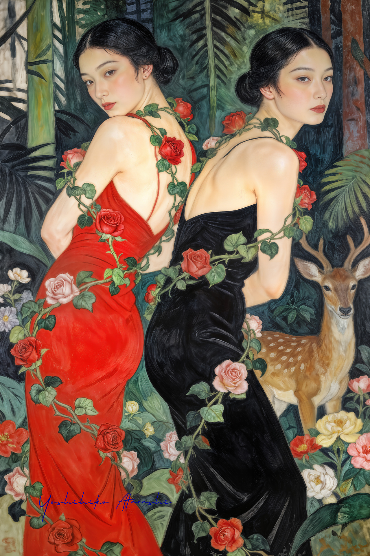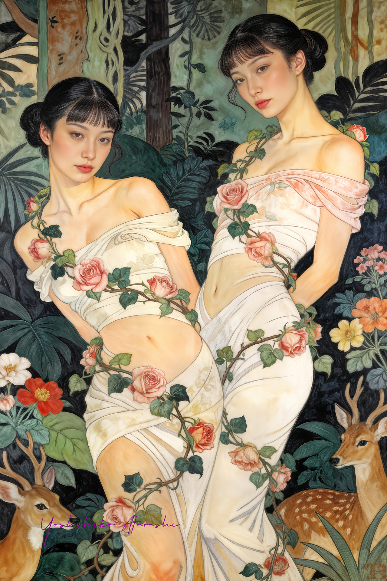 作意図 これらの作品は、自然と人、そして都市の気配が静かに重なり合う瞬間を描いています。蛇や植物、鹿といった象徴的なモチーフは、生命の循 環や内なる欲望、再生のイメージとして配置しました。曲線を強調した人体表現と装飾的な画面構成は、日本画や装飾絵画の影響を意識しつ つ、現代的な感性で再構成しています。見る人が物語を読み取るのではなく、時間や感情の揺らぎを画面の中で漂わせることを大切にしまし た。 。 |